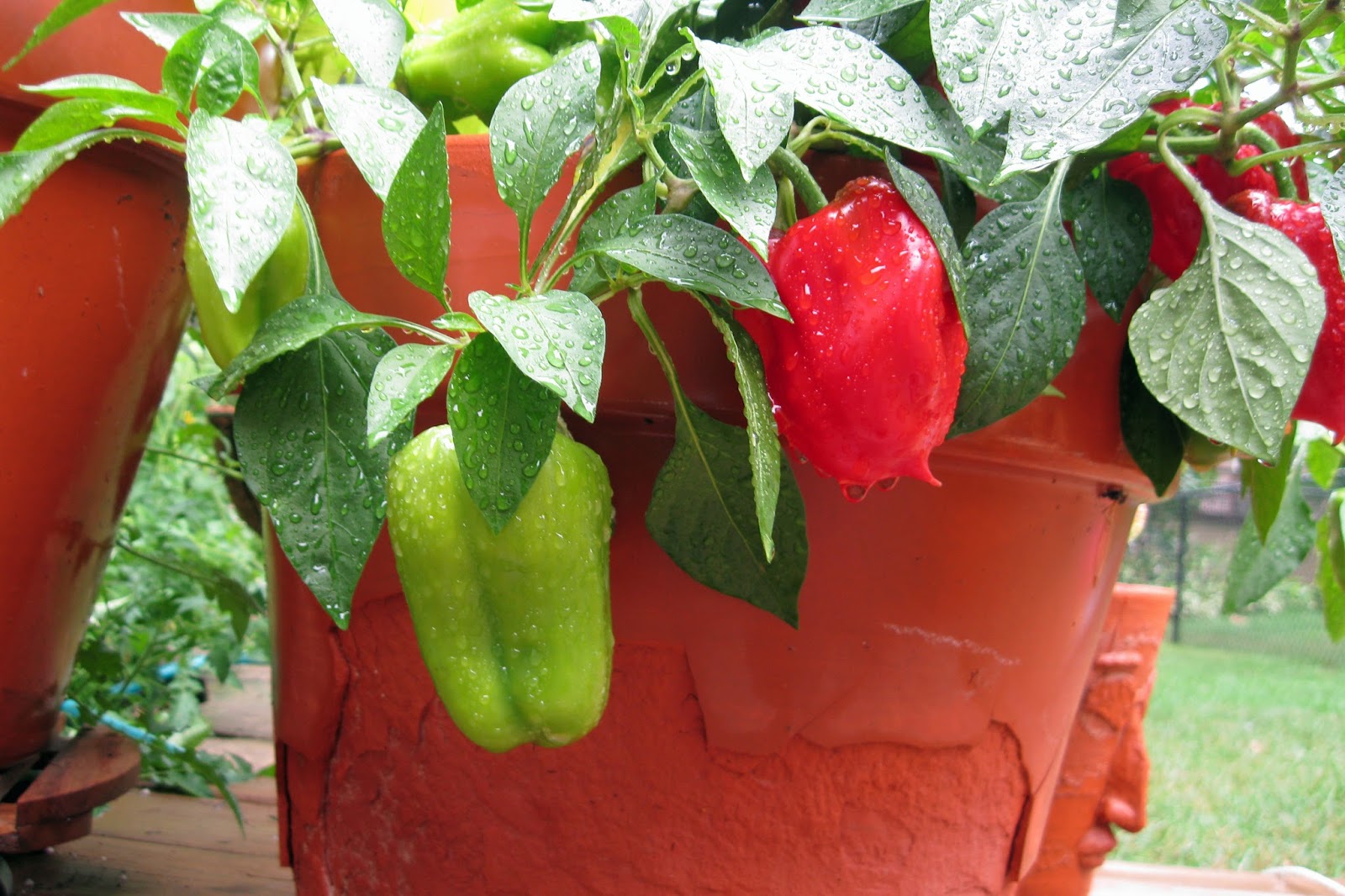 My garden is smaller this year but I have a good crop of bell peppers. Lincoln helped me harvest this morning and although he didn't want any the peppers were a great addition to our lunch salads. I am loving the bright red peppers decorating my patio. The tomatoes are mostly green. There are lots of them but the few that I have harvested are a bit mealy. I hope the rest are better.